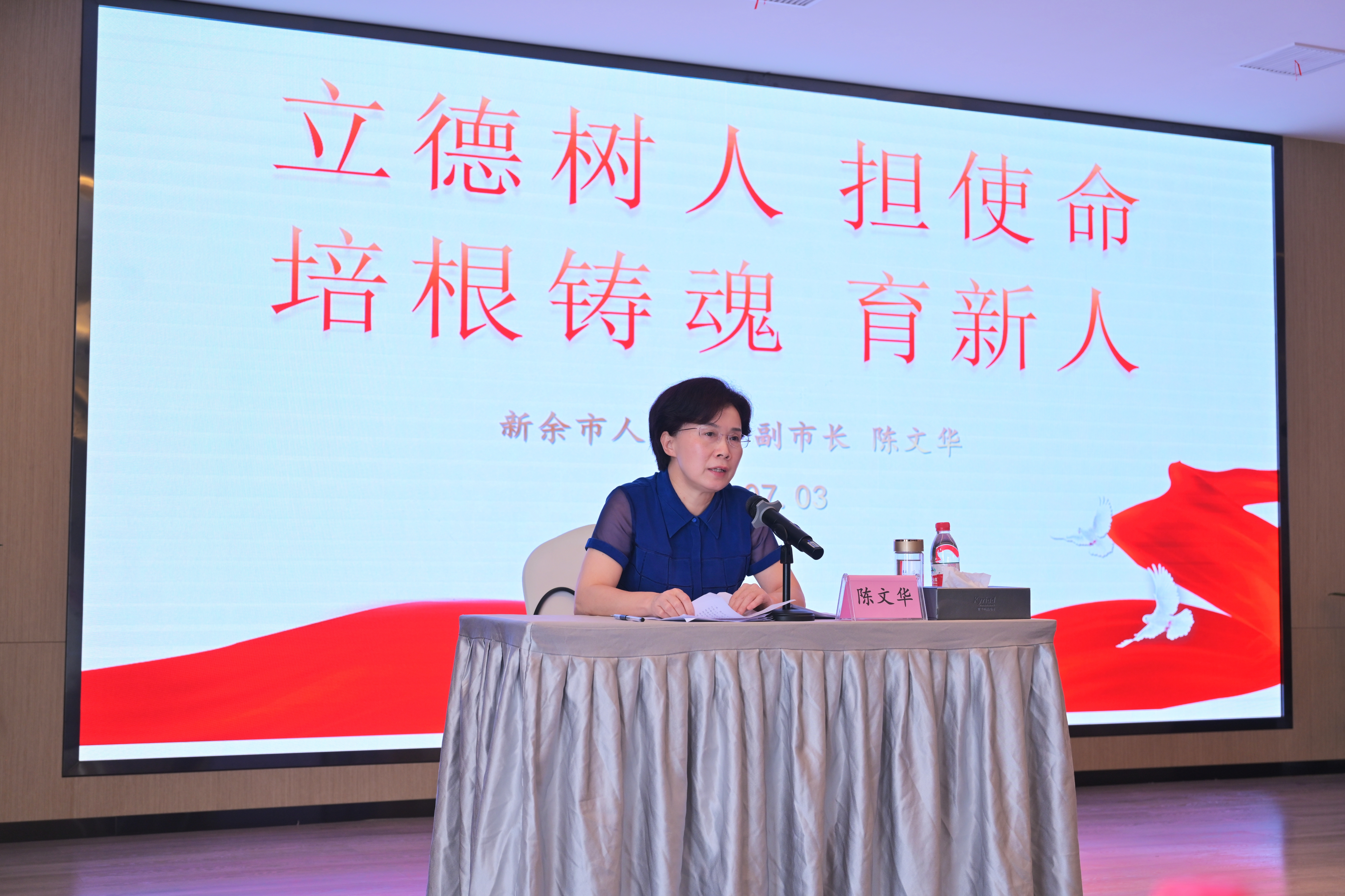 7月3日下午,新余市人民政府副市长陈文华以《立德树人担使命 培根铸魂育新人》为题为学员授课,陈市长强调思政课教师要严守底线、注重实效、学以致用,要求老师们树立一个认知,聚焦一个问题,找到一套方法,利用一体化资源,建设一体化队伍,构建一体化平台,达到一体化效果。