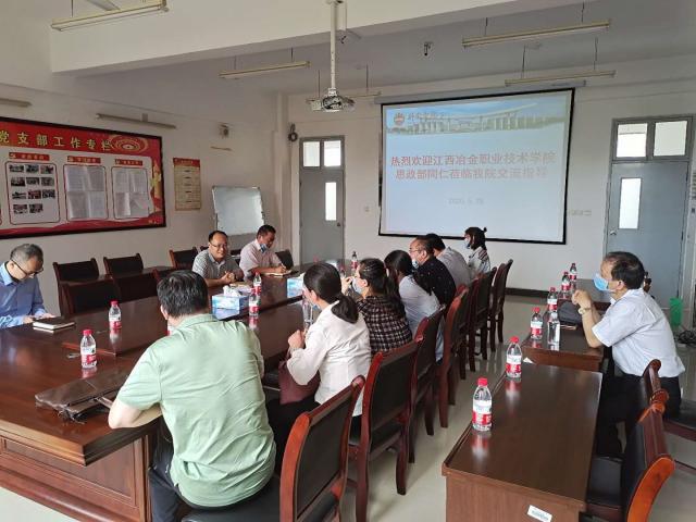 敖卫东主任介绍了江西冶金职业技术公司的建校历史、思政部团队队伍建设、思政课教学情况及未来发展愿景。随后,双方与会人员就实践课教学、VR实验室建设、课程思政建设、高层次人才引进等问题展开了深入交流和探讨。交流会后,敖卫东主任一行参观了公司思政课智慧教室和VR思政教学研究中心。