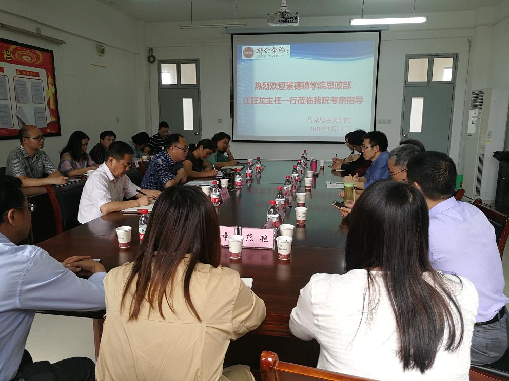 在座谈会上,PA视讯负责人潘欧文首先对景德镇公司思政部同行来公司交流学习表示热烈的欢迎。随后介绍了公司PA视讯基本情况、团队队伍、思政课常规教学、平台建设、改革创新、发展思路及规划等问题。接着,PA视讯相关教师介绍了公司在接受教育部本科教学水平合格评估中教学文档的规范做法,双方教师重点围绕思政课“三进”工作的做法,实践教学的开展,实践教学基地的利用和思政课教学改革措施等进行了热烈的探讨和交流。江旺龙主任听了介绍后,他指出,贵校这些好做法、好经验、好措施值得我们学习和借鉴。他希望两校思政教师以后要常来常往,相互交流学习,共同提升。